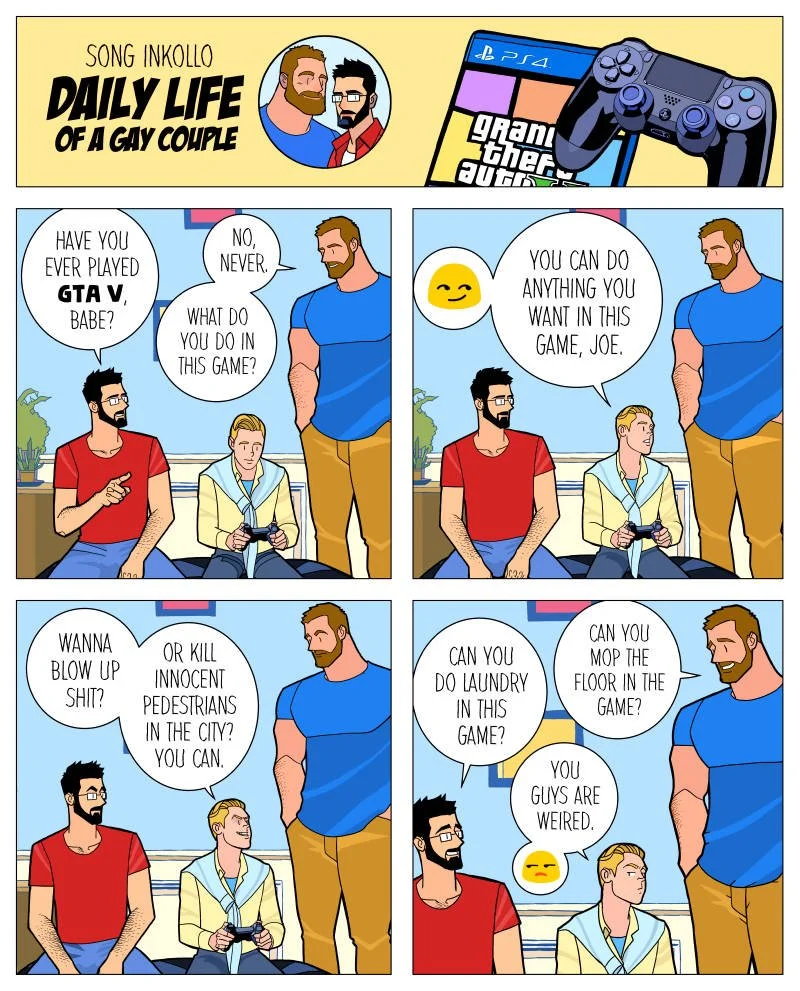 We are invited to a straight couple friends'house, and their 14-years-old son just got his birthday present - A Playstation 4. And he spent a lot of time playing GTA5. None of us two has actually played this game before. XD